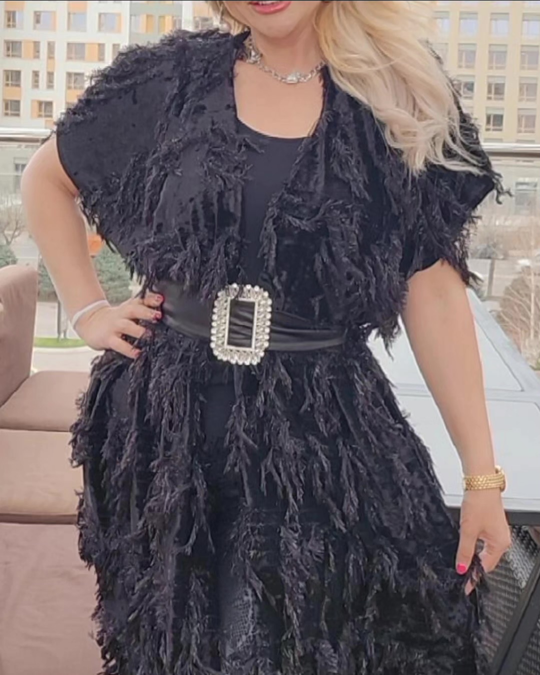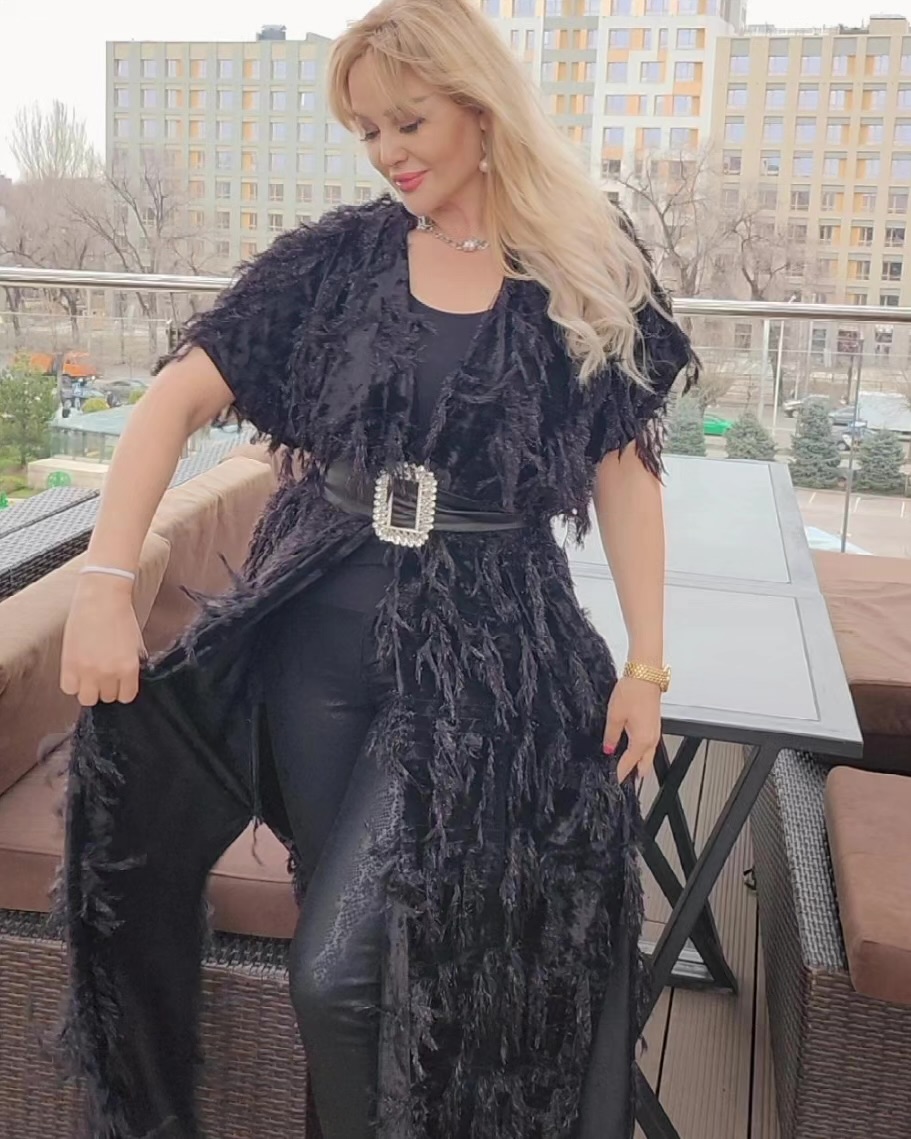 Накидка «Ночная Изысканность» — это воплощение роскоши и элегантности. Изготовленная из черного, мягкого и нежного материала, она придает образу изысканность и загадочность. Эта длинная накидка идеально подходит для особых случаев и вечерних выходов, создавая великолепный и утонченный стиль. Украшенный кожаный пояс с пряжкой, украшенной камнями Сваровски, добавляет роскоши и блеска вашему образу. Боковые карманы и удобные боковые разрезы обеспечивают комфорт и свободу движений.