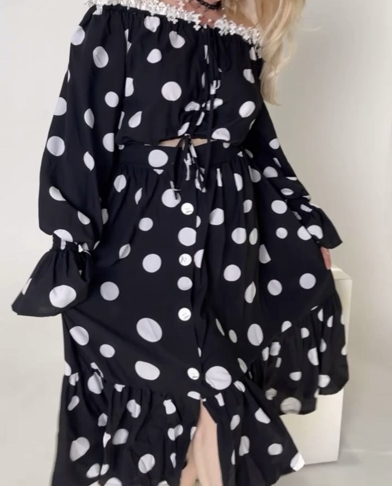 Платье «Short n’ Sweet» — это элегантное сочетание классики и игривости. Изготовлено из легкого, струящегося материала черного цвета, украшенного белыми кружочками, которые добавляют наряду очарование и ретро-шик. Удобный приталенный крой подчеркивает фигуру, а свободная юбка придает легкость и женственность.