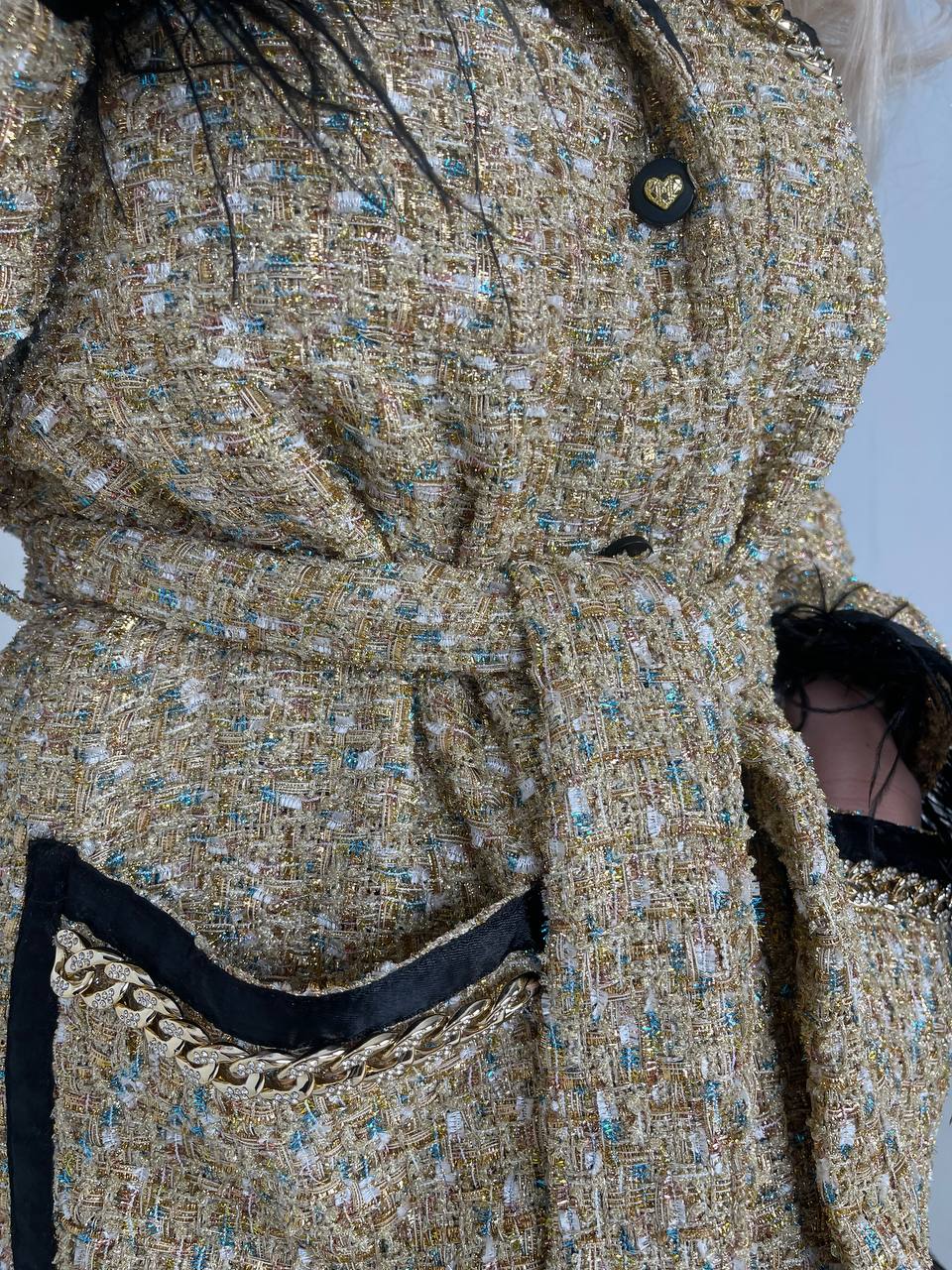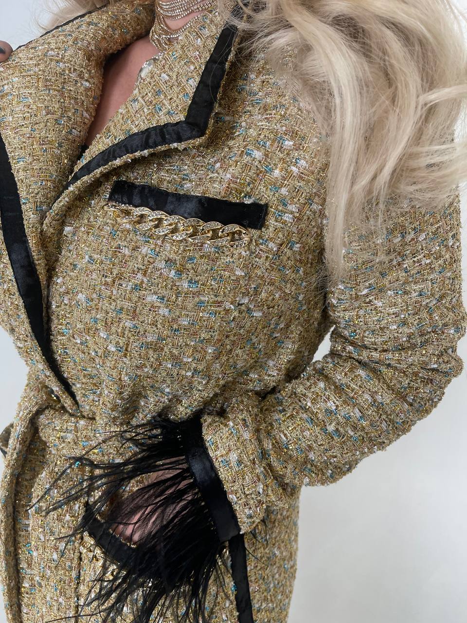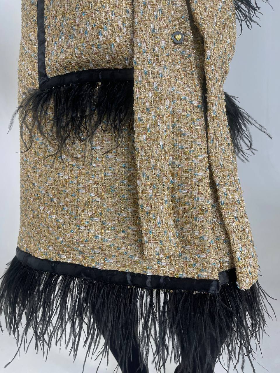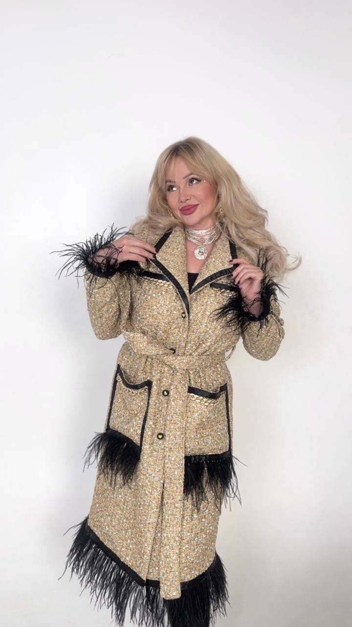 Эффектный и стильный тренч из твида – идеальный выбор для тех, кто хочет подчеркнуть свою индивидуальность! Изготовлен из премиум ткани, которая не только выглядит роскошно, но и обеспечивает тепло и комфорт. Черные вставки и акценты из перьев на рукавах, карманах и подоле делают это изделие особенным и привносят нотку гламура в повседневный образ.