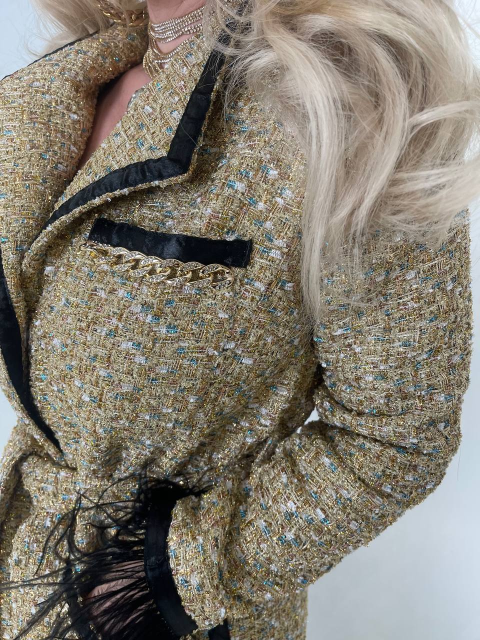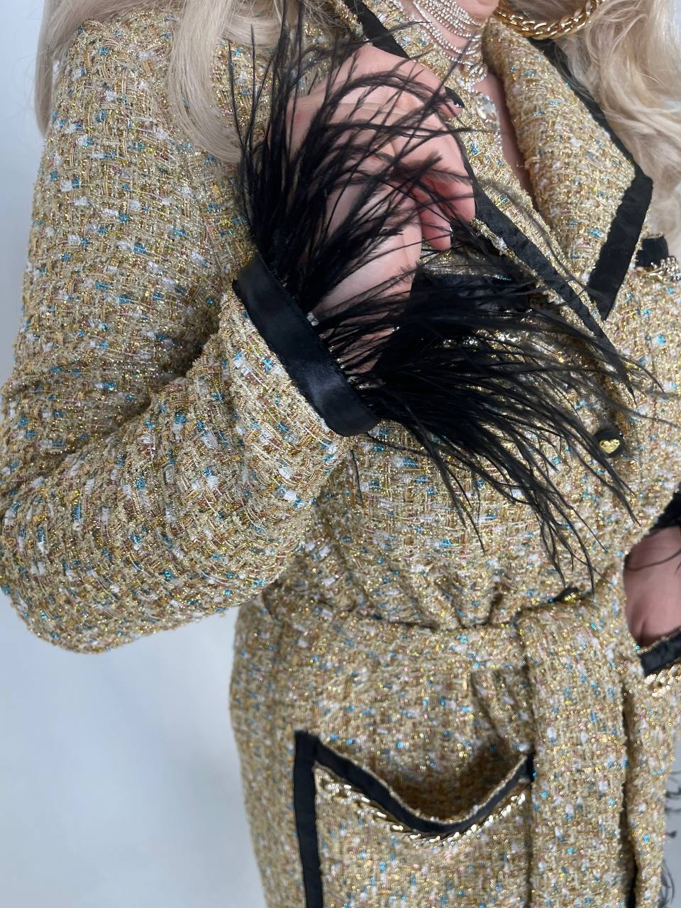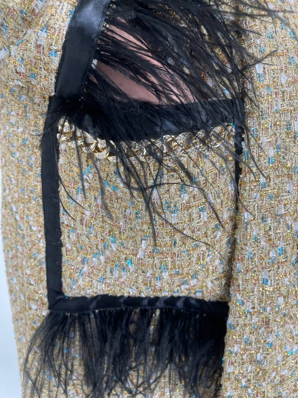 Эффектный и стильный тренч из твида – идеальный выбор для тех, кто хочет подчеркнуть свою индивидуальность! Изготовлен из премиум ткани, которая не только выглядит роскошно, но и обеспечивает тепло и комфорт. Черные вставки и акценты из перьев на рукавах, карманах и подоле делают это изделие особенным и привносят нотку гламура в повседневный образ.