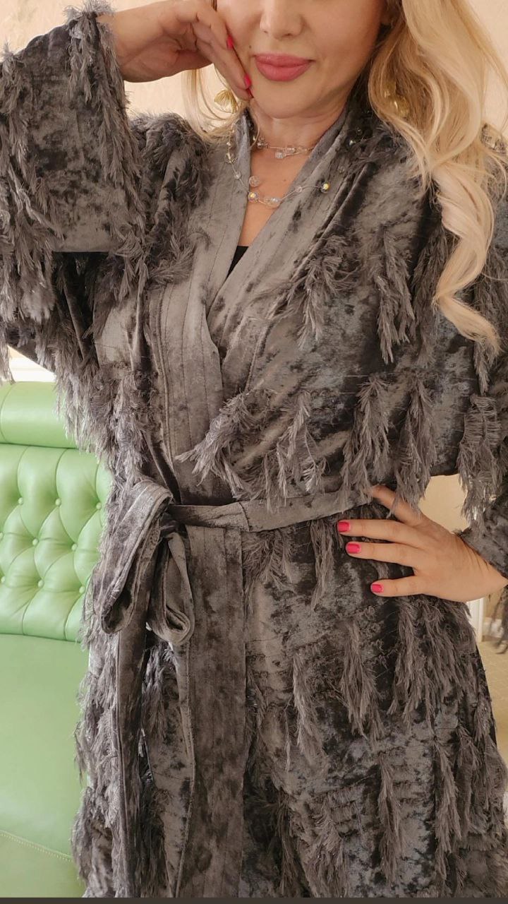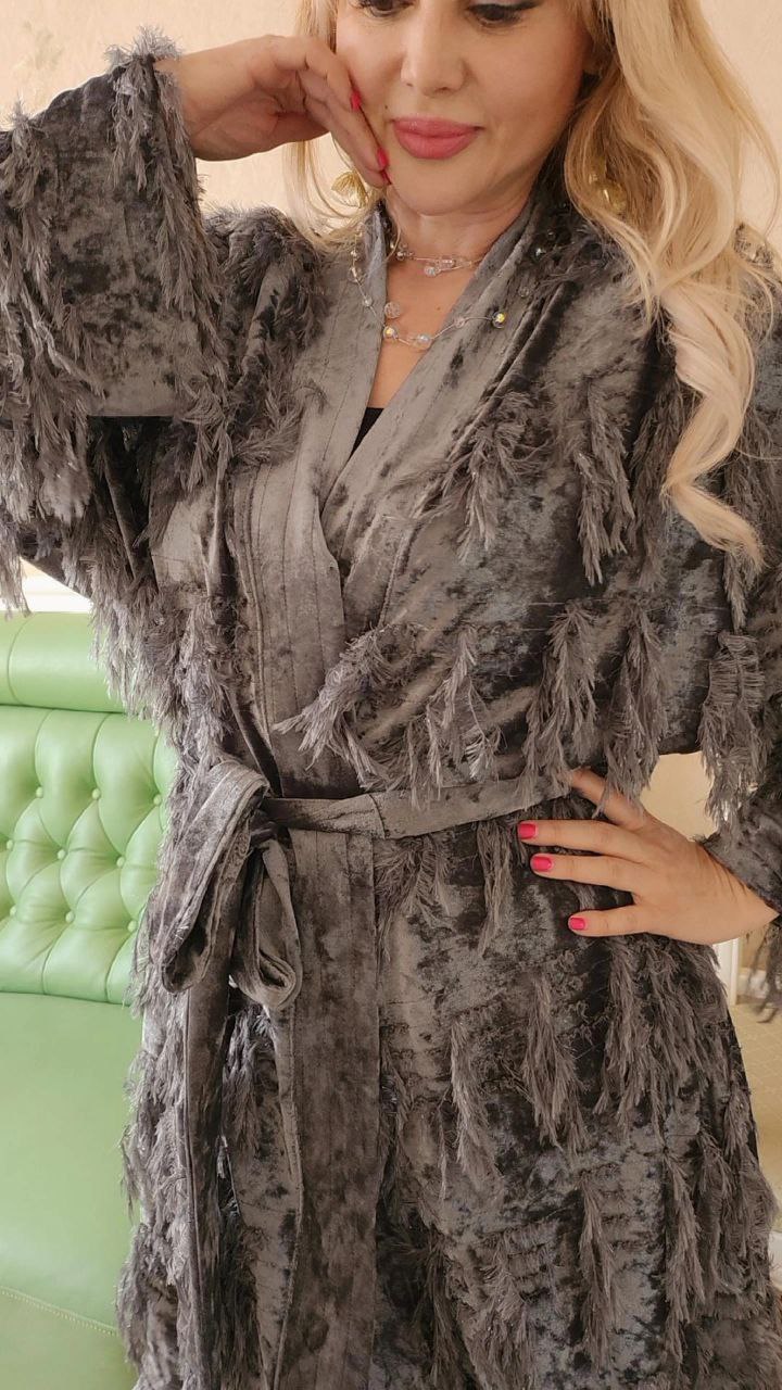 Накидка «Вечерняя Тень» — это элегантное сочетание стиля и загадочности. Изготовленная из черного, легкого и нежного материала, она придает образу изысканность и роскошь. Эта накидка идеально подходит для вечерних мероприятий и особых случаев, создавая изысканный и элегантный образ. Боковые карманы и удобные боковые разрезы обеспечивают функциональность и свободу движений. В комплекте идет декоративный пояс, завершающий ваш стильный образ.